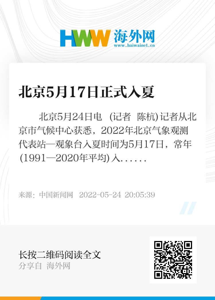 中新网北京5月24日电 (记者 陈杭)记者从北京市气候中心获悉,2022年北京气象观测代表站—观象台入夏时间为5月17日,常年(1991—2020年平均)入夏时间为5月20日。