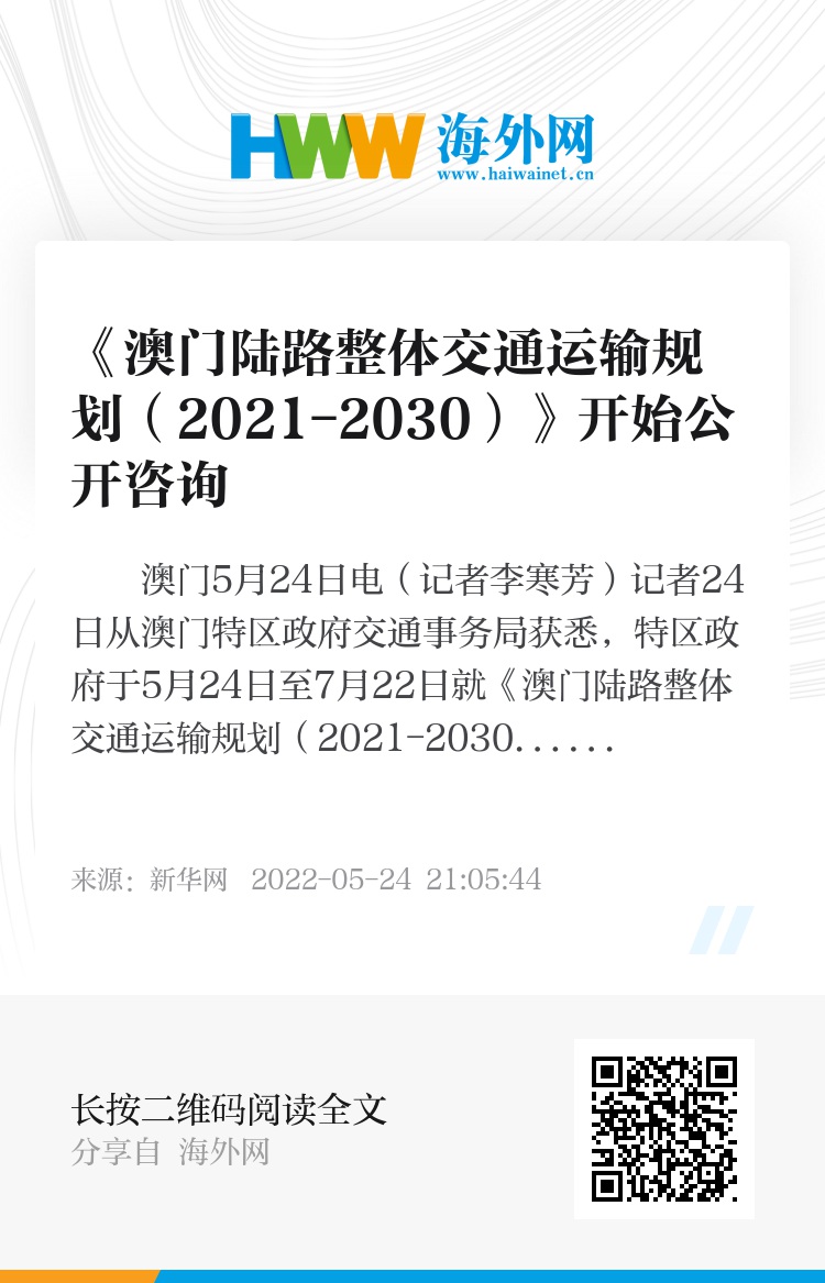 新华社澳门5月24日电(记者李寒芳)记者24日从澳门特区政府交通事务局获悉,特区政府于5月24日至7月22日就《澳门陆路整体交通运输规划(2021-2030)》展开公开咨询。