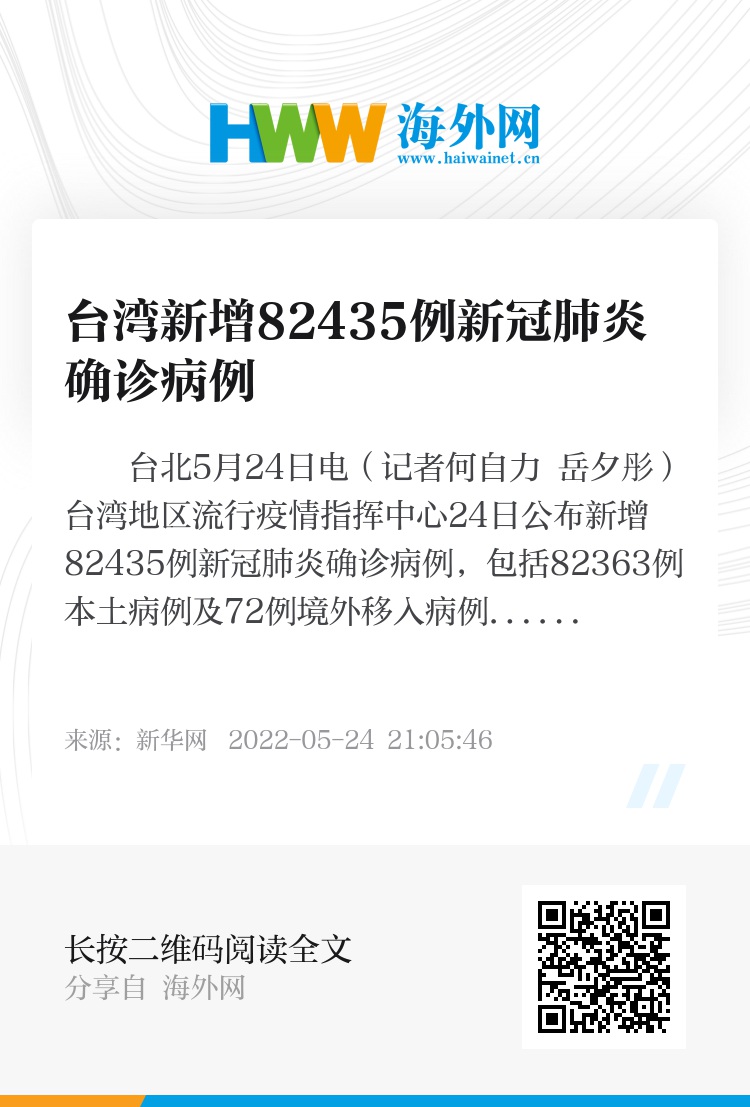新华社台北5月24日电(记者何自力 岳夕彤)台湾地区流行疫情指挥中心24日公布新增82435例新冠肺炎确诊病例,包括82363例本土病例及72例境外移入病例。确诊病例中新增42例死亡。