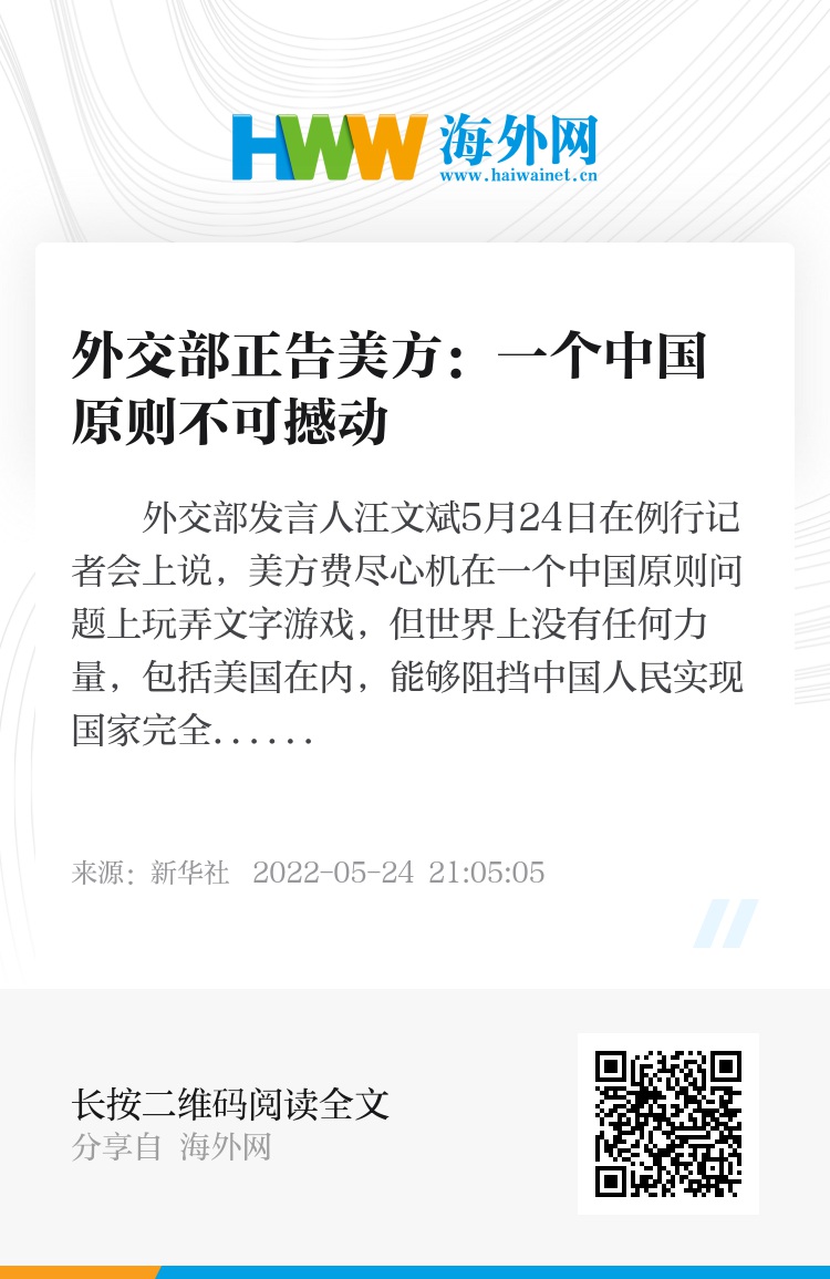 外交部发言人汪文斌5月24日在例行记者会上说,美方费尽心机在一个中国原则问题上玩弄文字游戏,但世界上没有任何力量,包括美国在内,能够阻挡中国人民实现国家完全统一的步伐。世界上也没有任何力量,包括美国在内,能够挽救“台独”势力失败的命运。