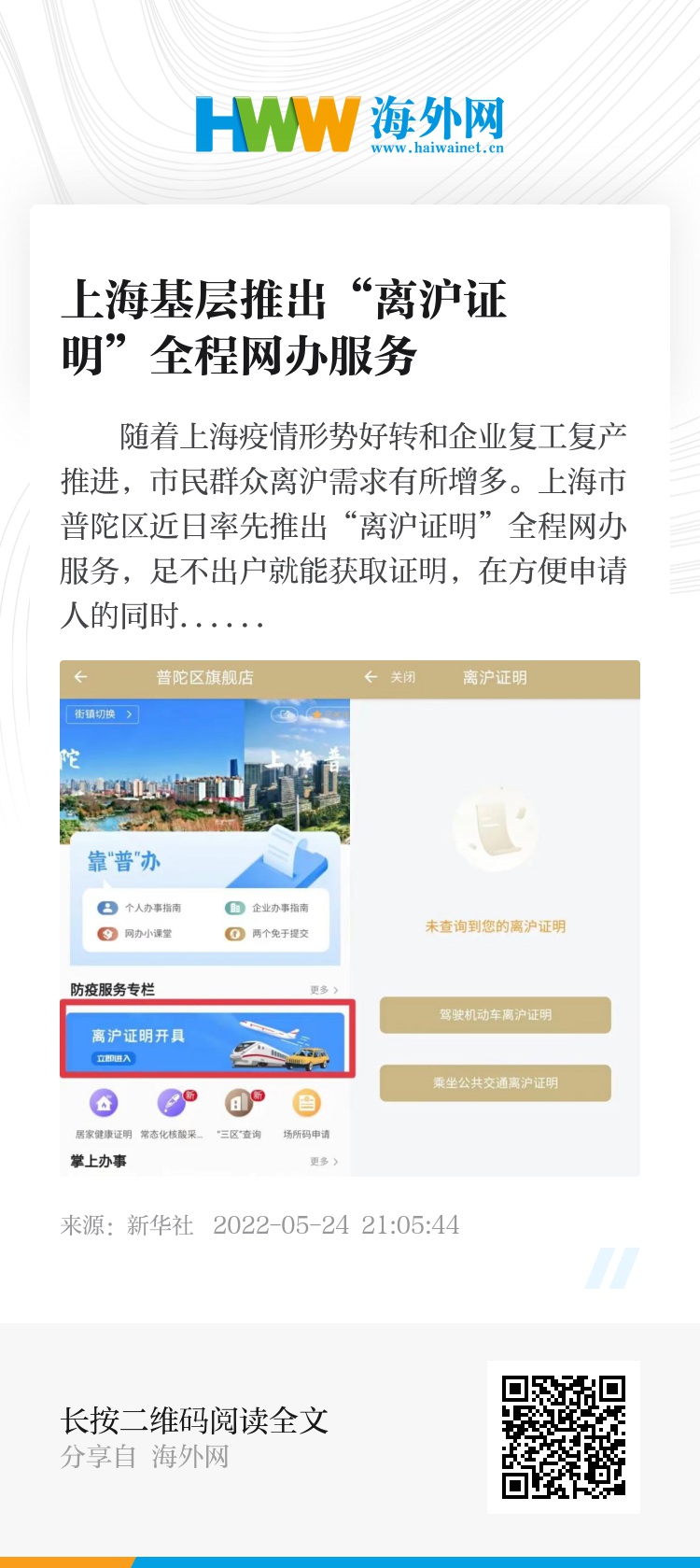随着上海疫情形势好转和企业复工复产推进,市民群众离沪需求有所增多。上海市普陀区近日率先推出“离沪证明”全程网办服务,足不出户就能获取证明,在方便申请人的同时也为社区基层减负。