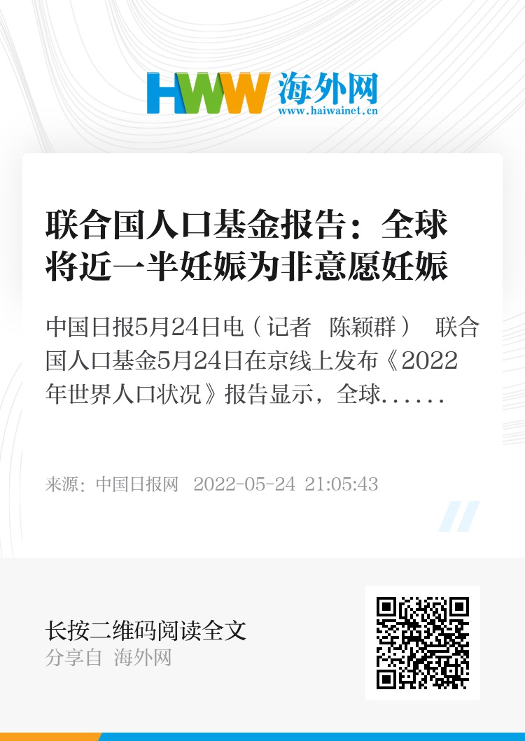 中国日报5月24日电(记者 陈颖群) 联合国人口基金5月24日在京线上发布《2022年世界人口状况》报告显示,全球每年有将近一半的妊娠为非意愿妊娠,非意愿妊娠的数量达1.21亿例。对于那些受影响的妇女和女童来说,面对是否怀孕这一最能改变其生活轨迹的生殖选择时,他们实际上根本没有选择。