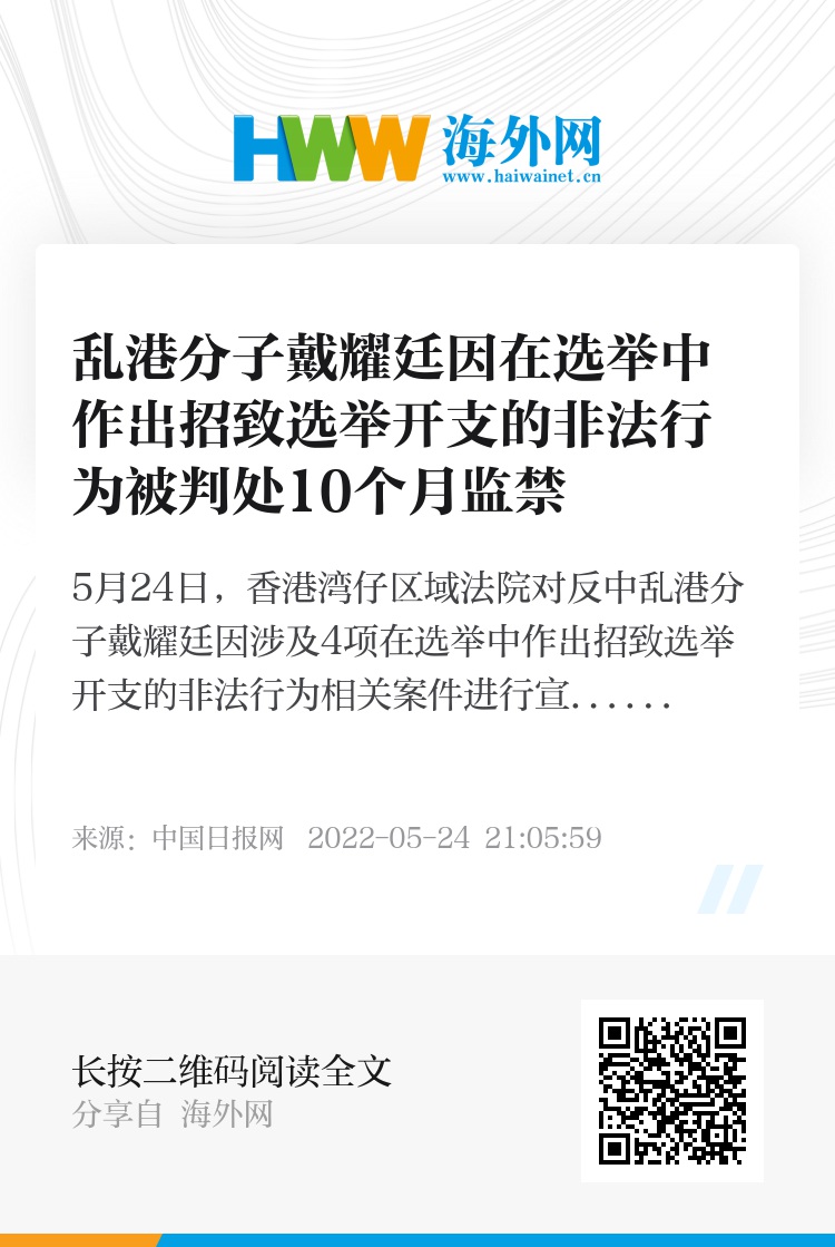 5月24日,香港湾仔区域法院对反中乱港分子戴耀廷因涉及4项在选举中作出招致选举开支的非法行为相关案件进行宣判。戴耀廷被判处10个月监禁。