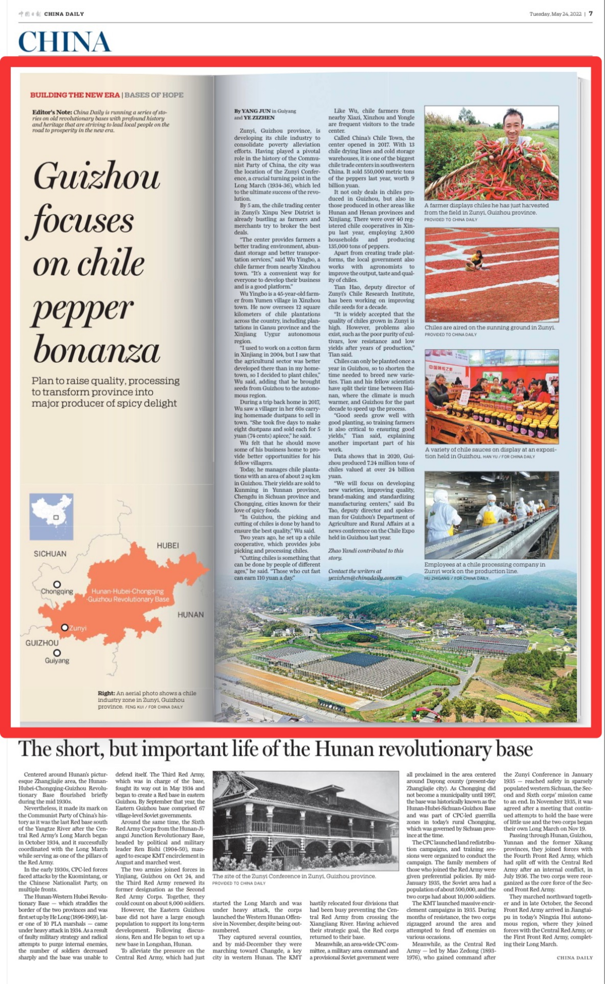 进入5月,革命老区贵州遵义的乡野间格外“红火”。在新蒲新区新舟镇的辣椒种植基地上,村民们正忙着将已育好的辣椒苗移栽到地里。遵义是全国主要的优质辣椒产区,辣椒产业也成为当地促进农业增效、农民增收的支柱产业。