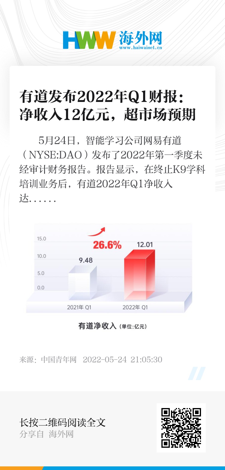 5月24日,智能学习公司网易有道(NYSE:DAO)发布了2022年第一季度未经审计财务报告。报告显示,在终止K9学科培训业务后,有道2022年Q1净收入达到12.01亿元,相较于2021年Q1同比增长了26.6%,超市场预期。
