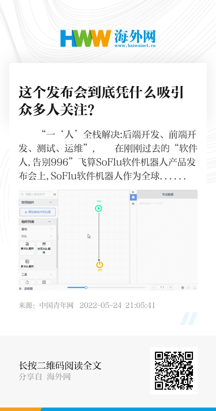 此次,中国原创的SoFlu软件机器人对自动化开发的进一步推动,可以说是掀起了一场软件开发方式的变革浪潮,不仅能让开发者从“重复造轮子”的困境中解放出来,有更多时间和精力专注于创新性设计,“让人人都成为全栈工程师”,进而推动软件行业发展。同时,让企业从劳动密集型转变为智能制造模式,实现降本增效,加速数字化转型进程。SoFlu软件机器人将始终坚持中国原创,通过持续自主创新加速推动企业更高效、更高质量地完成数字化转型,为我国数字经济的发展做出贡献。