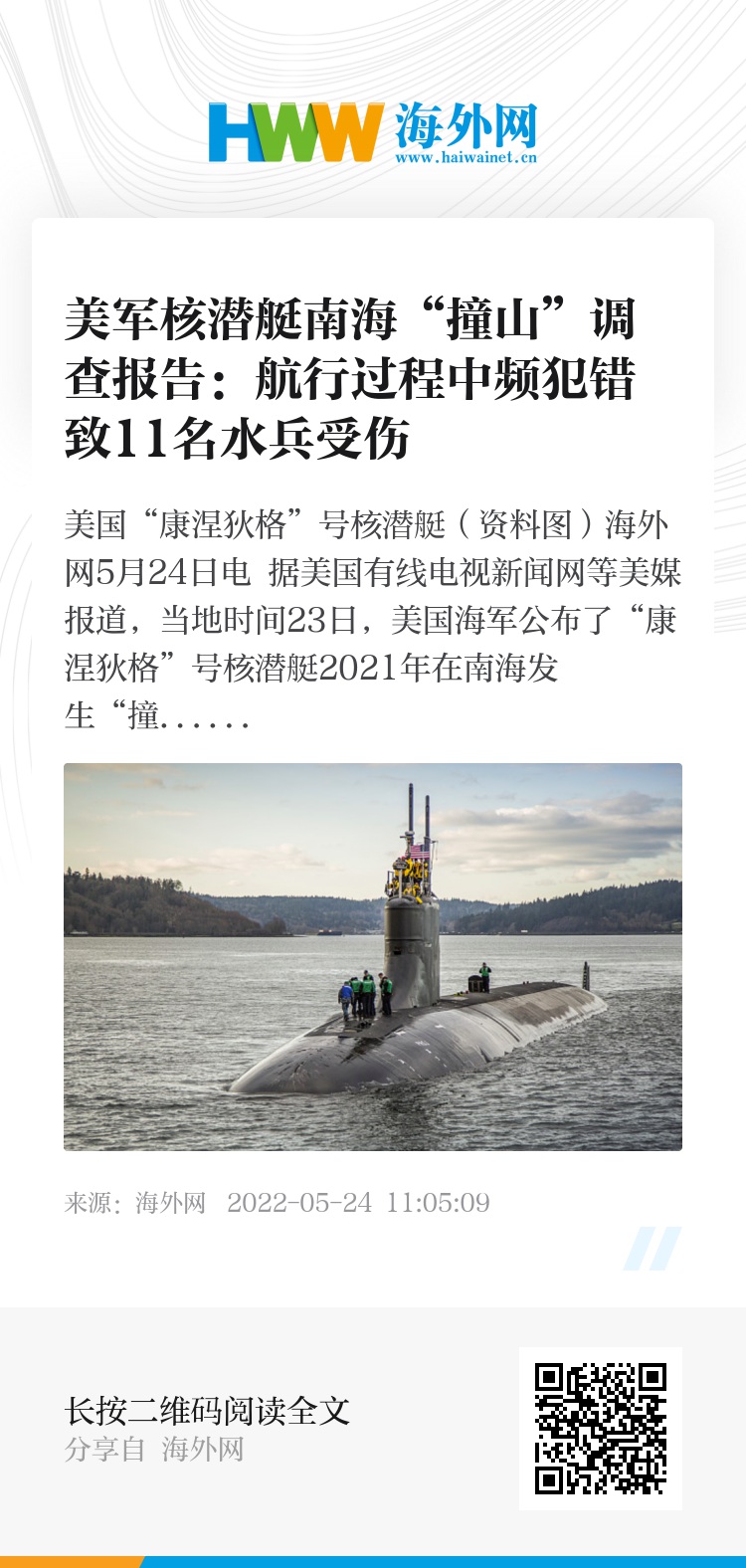 海外网5月24日电 据美国有线电视新闻网等美媒报道,当地时间23日,美国海军公布了“康涅狄格”号核潜艇2021年在南海发生“撞山”事故的最终调查报告。报告指出,事故原因与航行规划、风险管理等错误有关,导致11名水兵受伤,潜艇长时间无法运行。
