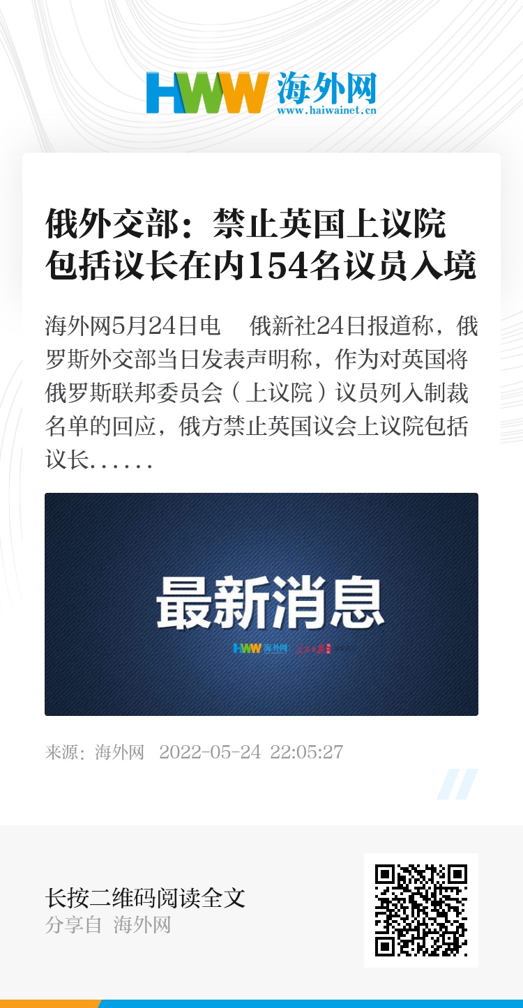 海外网5月24日电 俄新社24日报道称,俄罗斯外交部当日发表声明称,作为对英国将俄罗斯联邦委员会(上议院)议员列入制裁名单的回应,俄方禁止英国议会上议院包括议长在内的154名议员入境俄罗斯。(海外网 张琪)