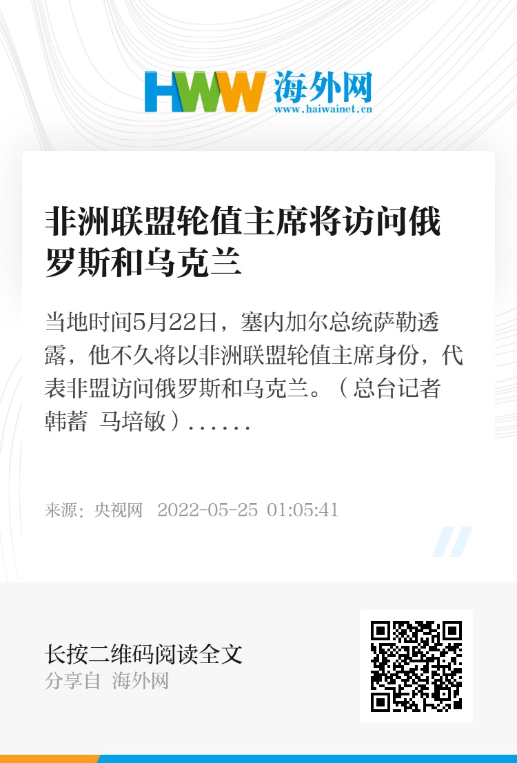 当地时间5月22日,塞内加尔总统萨勒透露,他不久将以非洲联盟轮值主席身份,代表非盟访问俄罗斯和乌克兰。(总台记者 韩蓄 马培敏)