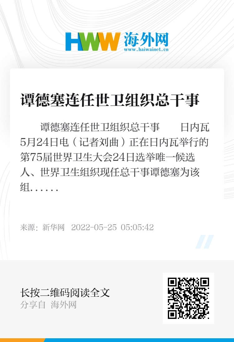 新华社日内瓦5月24日电(记者刘曲)正在日内瓦举行的第75届世界卫生大会24日选举唯一候选人、世界卫生组织现任总干事谭德塞为该组织下一任总干事。