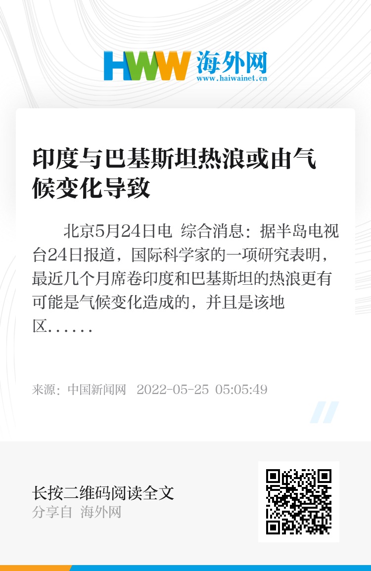 中新网北京5月24日电 综合消息:据半岛电视台24日报道,国际科学家的一项研究表明,最近几个月席卷印度和巴基斯坦的热浪更有可能是气候变化造成的,并且是该地区未来的一瞥。