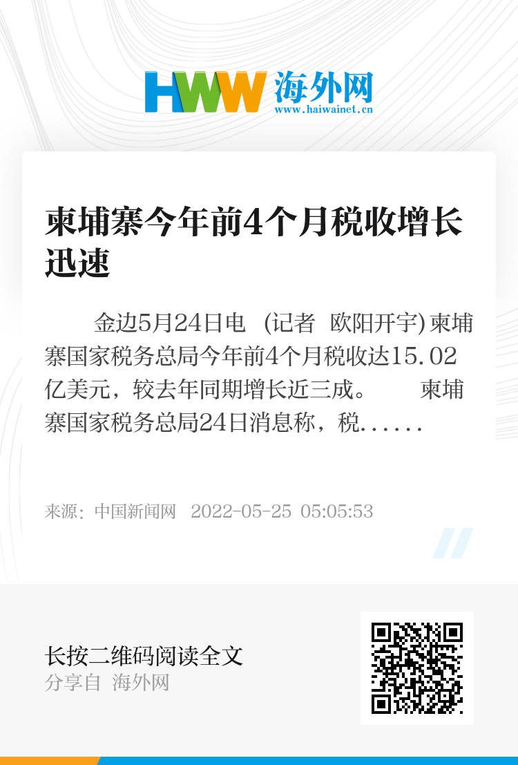 柬埔寨国家税务总监关威宝表示,今年首4个月税收激增,显示柬埔寨经济在疫后呈现强劲复苏势头。在成功推行全民接种新冠疫苗运动的基础下,柬埔寨政府在去年11月全面恢复社会和经济各个领域,带动商业和消费活动恢复,促使税收显著增长。