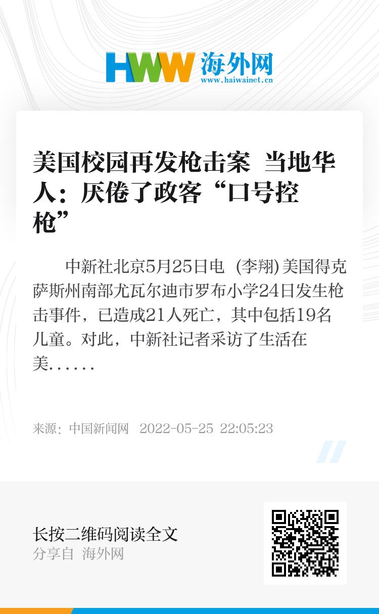 中新社北京5月25日电 (李翔)美国得克萨斯州南部尤瓦尔迪市罗布小学24日发生枪击事件,已造成21人死亡,其中包括19名儿童。对此,中新社记者采访了生活在美国的华人和律师,他们均表示对此案件感到震惊,同时表达了对于美国频频发生枪击案件的失望和无奈。