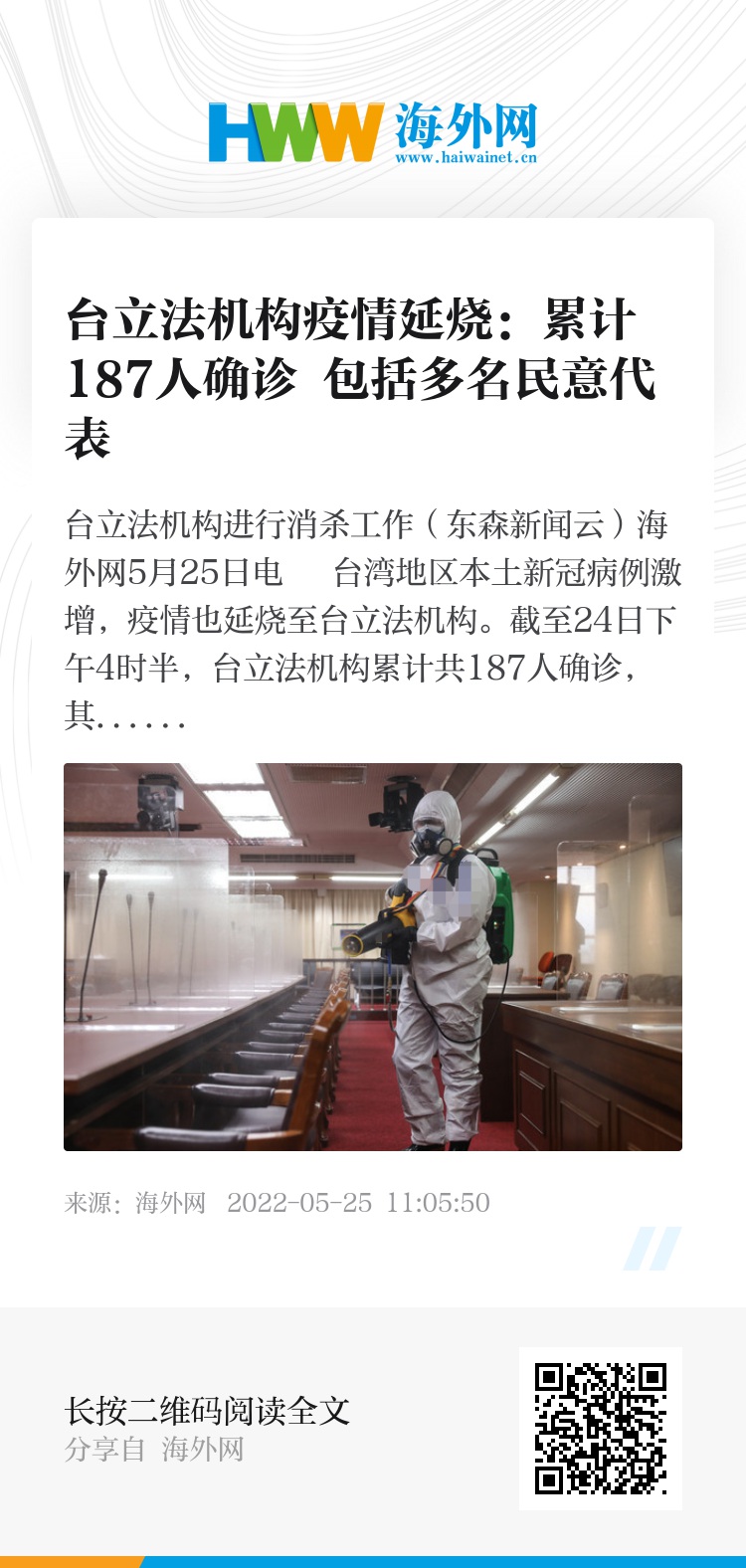 海外网5月25日电 台湾地区本土新冠病例激增,疫情也延烧至台立法机构。截至24日下午4时半,台立法机构累计共187人确诊,其中包括18名PCR呈阳性的民意代表,还有5名民代正在居家隔离中。