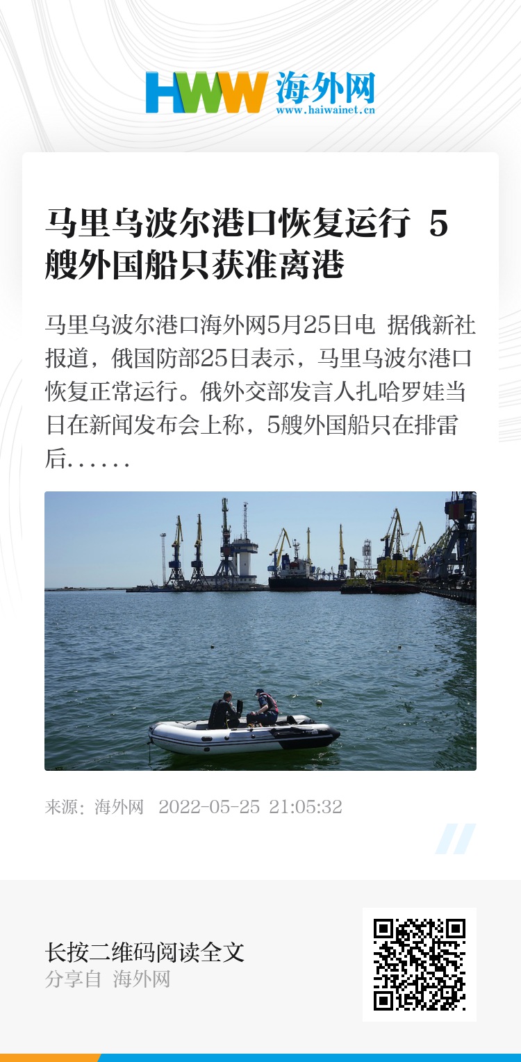 海外网5月25日电 据俄新社报道,俄国防部25日表示,马里乌波尔港口恢复正常运行。俄外交部发言人扎哈罗娃当日在新闻发布会上称,5艘外国船只在排雷后可以离开马里乌波尔港。