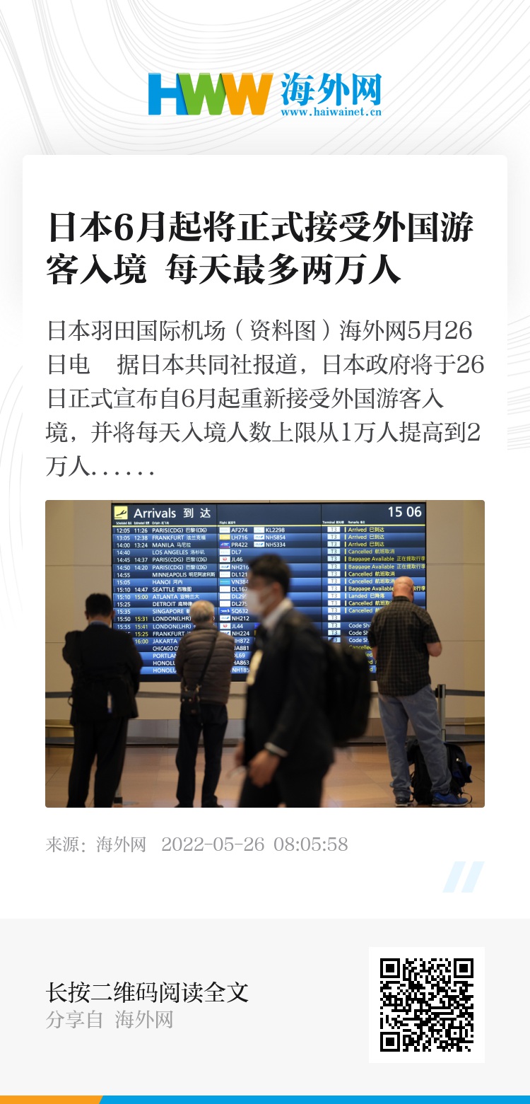 海外网5月26日电 据日本共同社报道,日本政府将于26日正式宣布自6月起重新接受外国游客入境,并将每天入境人数上限从1万人提高到2万人。