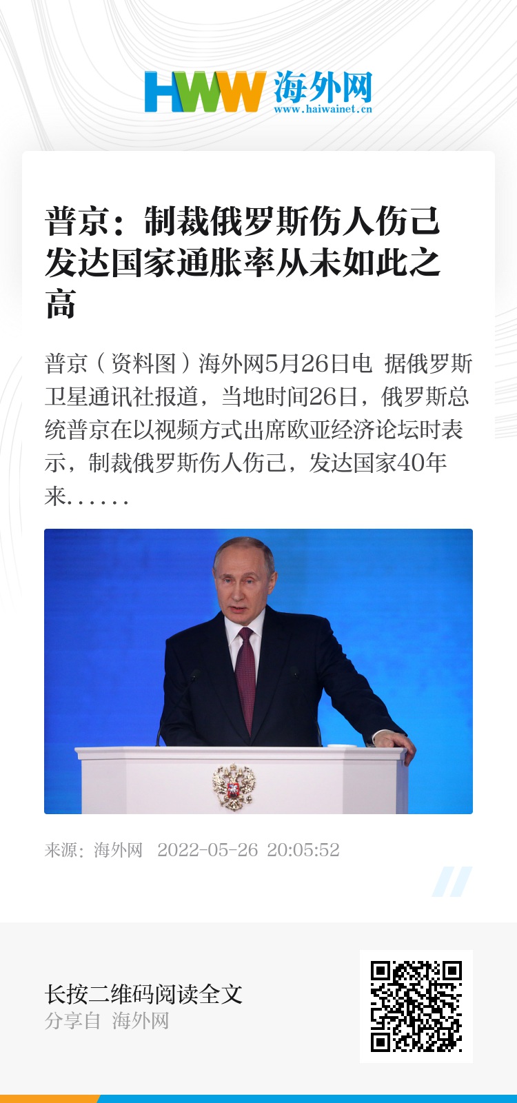 海外网5月26日电 据俄罗斯卫星通讯社报道,当地时间26日,俄罗斯总统普京在以视频方式出席欧亚经济论坛时表示,制裁俄罗斯伤人伤己,发达国家40年来从未出现如此高的通胀率。