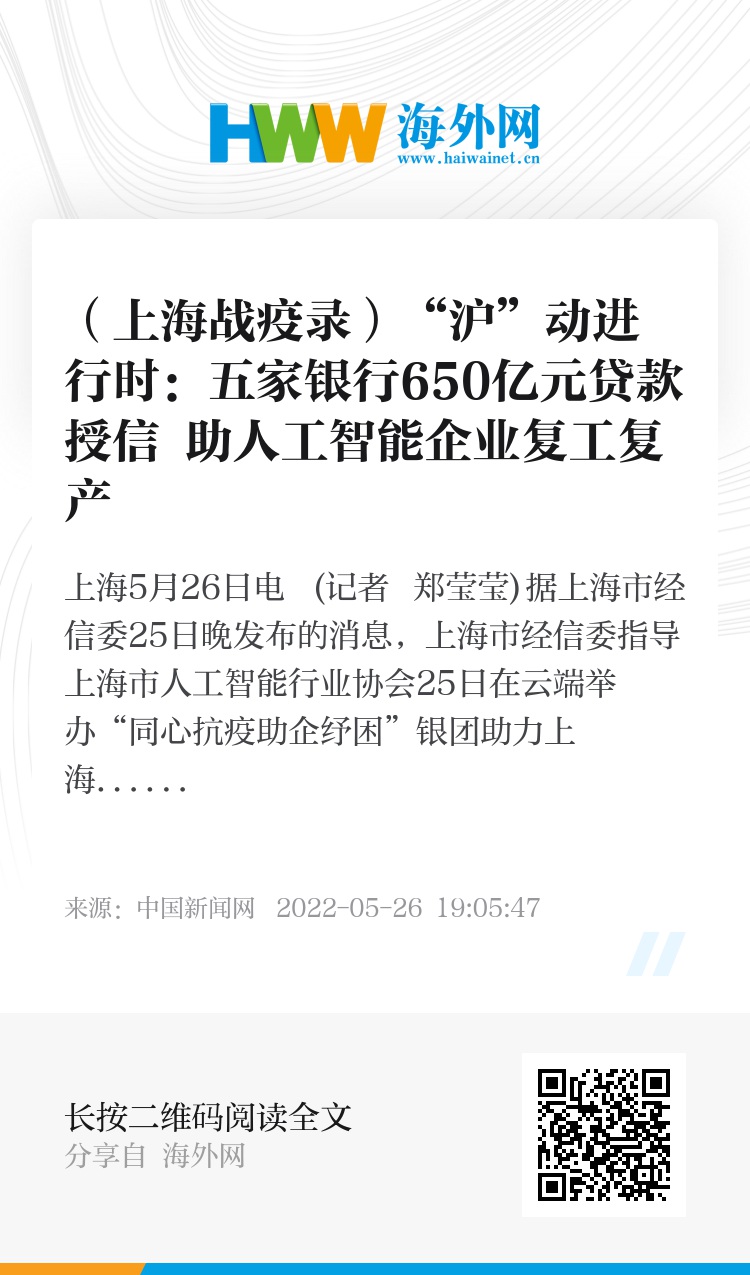中新网上海5月26日电 (记者 郑莹莹)据上海市经信委25日晚发布的消息,上海市经信委指导上海市人工智能行业协会25日在云端举办“同心抗疫助企纾困”银团助力上海人工智能企业复工复产专场活动。会上,中国工商银行、中国银行、浦发银行、中信银行和兴业银行五家银行上海市分行共同发布650亿元贷款总授信额度,助力上海市人工智能企业复工复产。