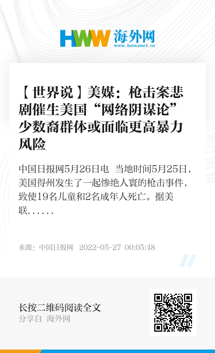中国日报网5月26日电 当地时间5月25日,美国得州发生了一起惨绝人寰的枪击事件,致使19名儿童和2名成年人死亡。