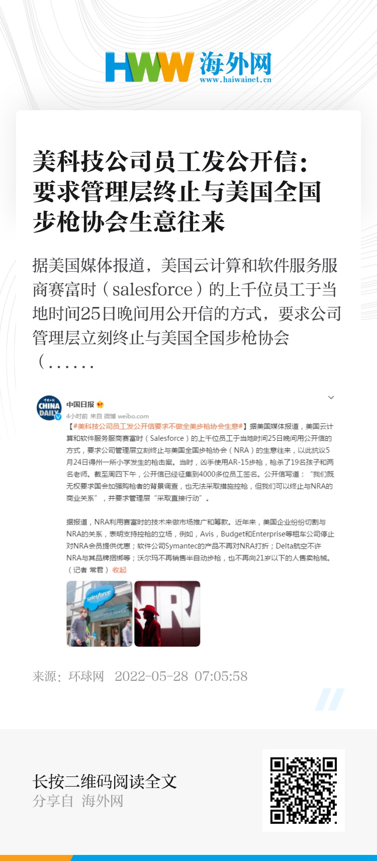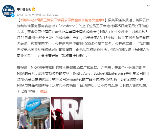 据美国媒体报道,美国云计算和软件服务服商赛富时(salesforce)的上千位员工于当地时间25日晚间用公开信的方式,要求公司管理层立刻终止与美国全国步枪协会(NRA)的生意往来,以此抗议5月24日得州一所小学发生的枪击案。当时,凶手使用AR-15步枪,枪杀了19名孩子和两名老师。截至周四下午,公开信已经征集到4000多位员工签名。公开信写道:“我们既无权要求国会加强购枪者的背景调查,也无法采取措施控枪,但我们可以终止与NRA的商业关系”,并要求管理层“采取直接行动”。