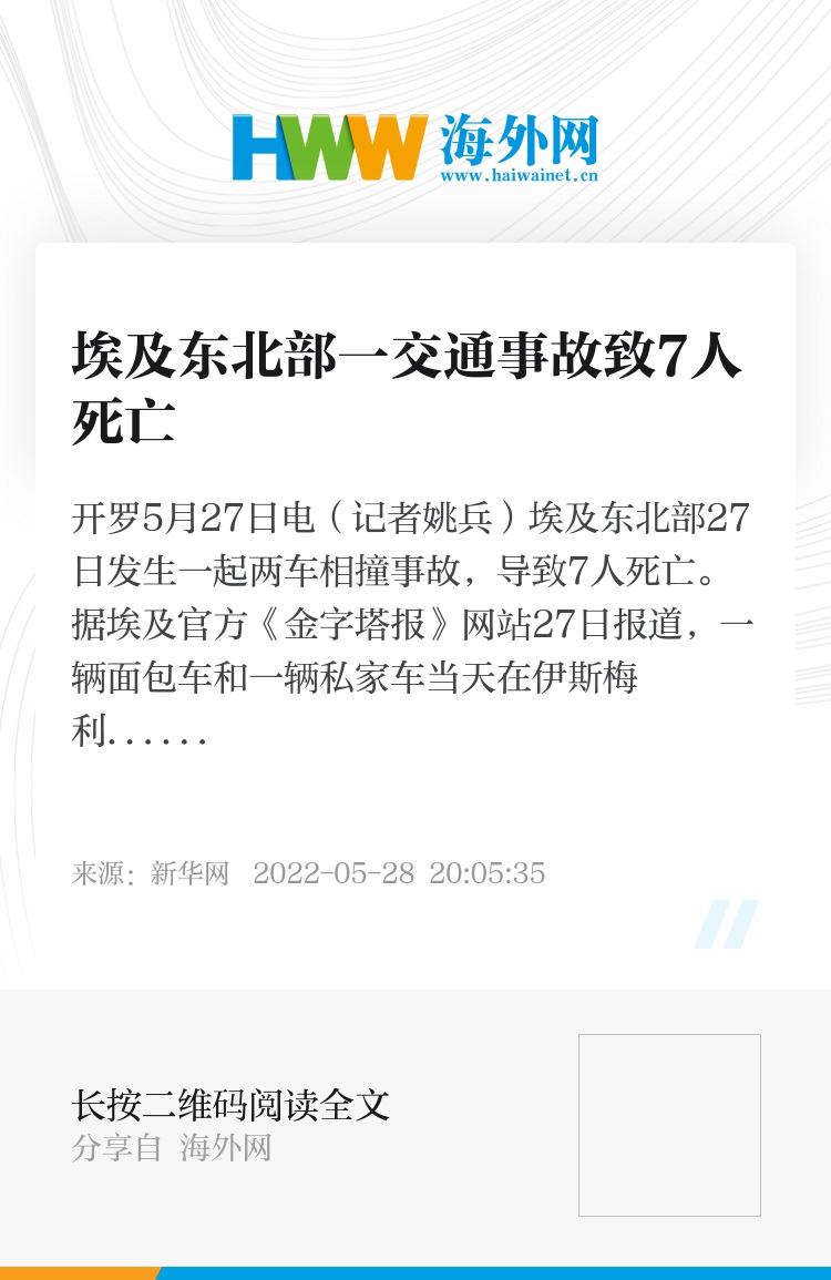 新华社开罗5月27日电(记者姚兵)埃及东北部27日发生一起两车相撞事故,导致7人死亡。