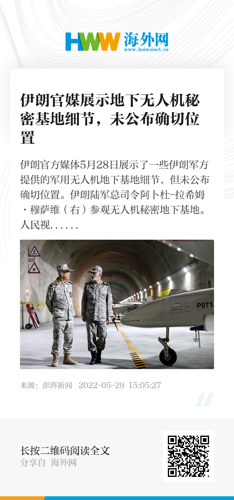 伊朗官方媒体5月28日展示了一些伊朗军方提供的军用无人机地下基地细节,但未公布确切位置。