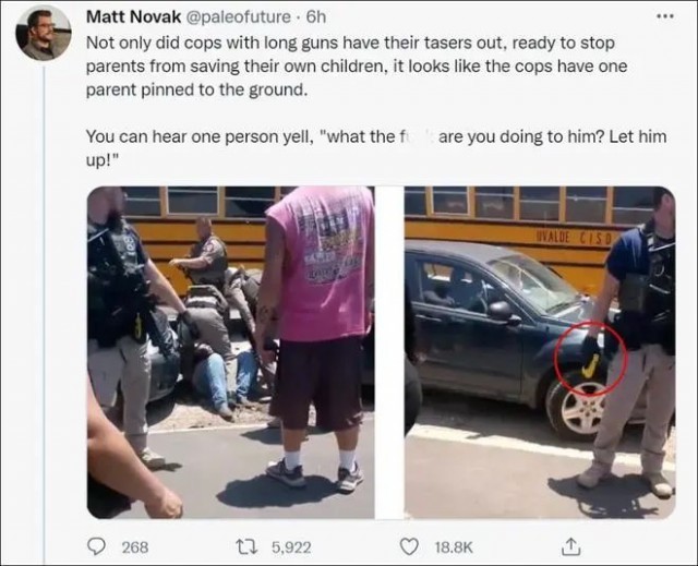 随后,诺瓦克还附上了源自社交媒体情报机构Storyful News的完整版视频,并发推指出:带着长枪的警察们不仅拿出了泰瑟枪,准备阻止父母们救自己的孩子,看起来警察们还把其中一位家长按倒在了地上。从视频中可以听到一个人大喊:“你对他做了什么?让他起来!”
