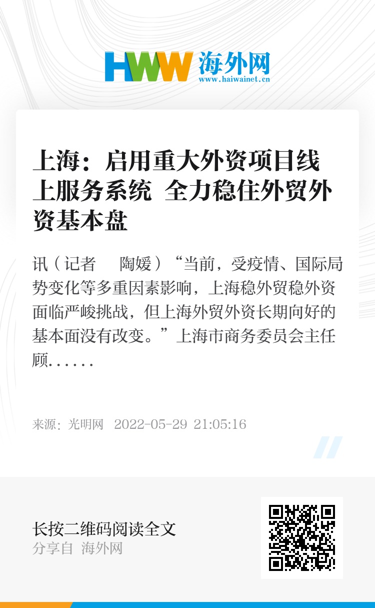 光明网讯(记者 陶媛)“当前,受疫情、国际局势变化等多重因素影响,上海稳外贸稳外资面临严峻挑战,但上海外贸外资长期向好的基本面没有改变。”上海市商务委员会主任顾军在今日(5月29日)举行的上海市新冠疫情防控工作第198场新闻发布会上介绍,上海持续优化营商环境,多措并举综合施策,全力稳住外贸外资基本盘,全力稳定企业在沪发展的预期和信心。