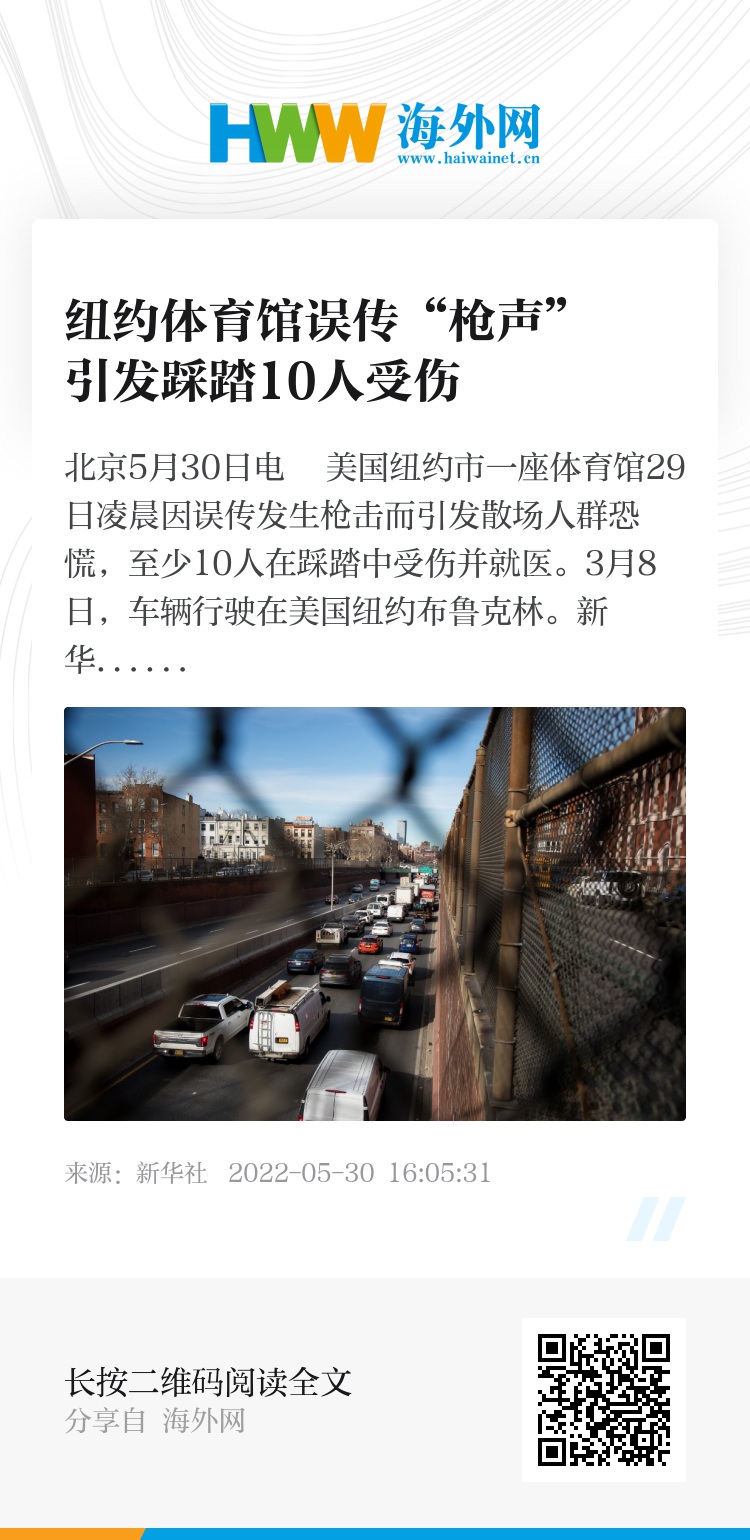 新华社北京5月30日电 美国纽约市一座体育馆29日凌晨因误传发生枪击而引发散场人群恐慌,至少10人在踩踏中受伤并就医。