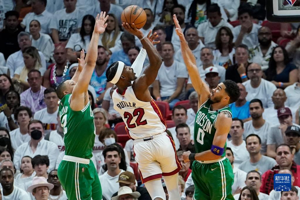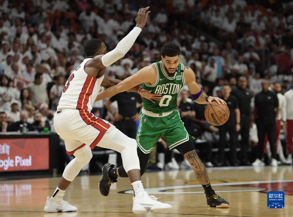 5月29日,凯尔特人队球员塔图姆(右)与格兰特·威廉姆斯(左)在比赛中防守热火队球员巴特勒。新华社/美联