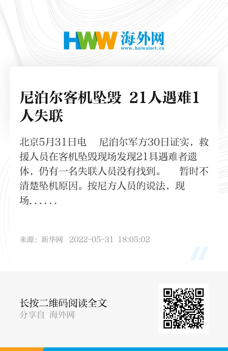新华社北京5月31日电 尼泊尔军方30日证实,救援人员在客机坠毁现场发现21具遇难者遗体,仍有一名失联人员没有找到。