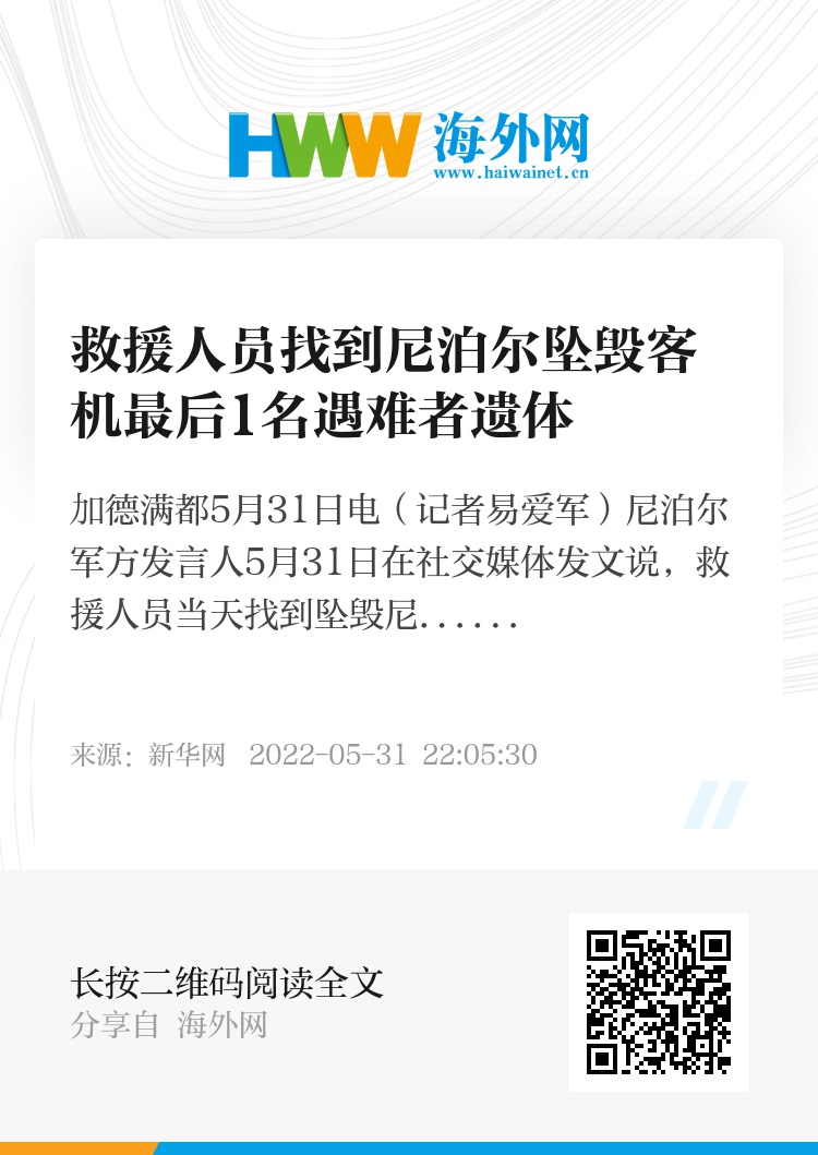 新华社加德满都5月31日电(记者易爱军)尼泊尔军方发言人5月31日在社交媒体发文说,救援人员当天找到坠毁尼泊尔客机最后一名遇难者遗体。至此,22名遇难者遗体全部找到。