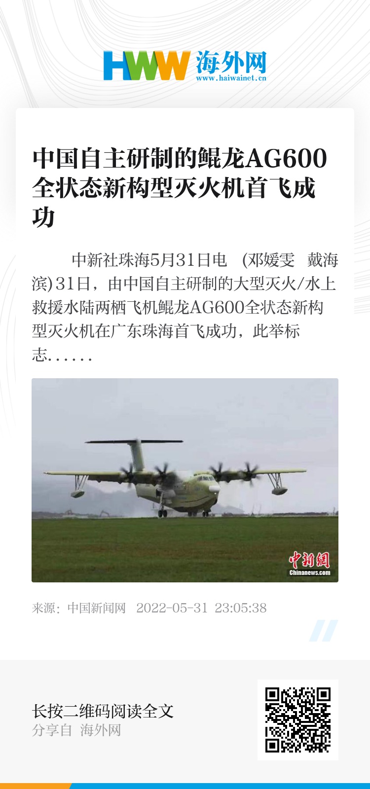 中新社珠海5月31日电 (邓媛雯 戴海滨)31日,由中国自主研制的大型灭火/水上救援水陆两栖飞机鲲龙AG600全状态新构型灭火机在广东珠海首飞成功,此举标志着鲲龙AG600项目全面进入加速发展的新阶段,也标志着灭火功能型号研制取得重大突破。