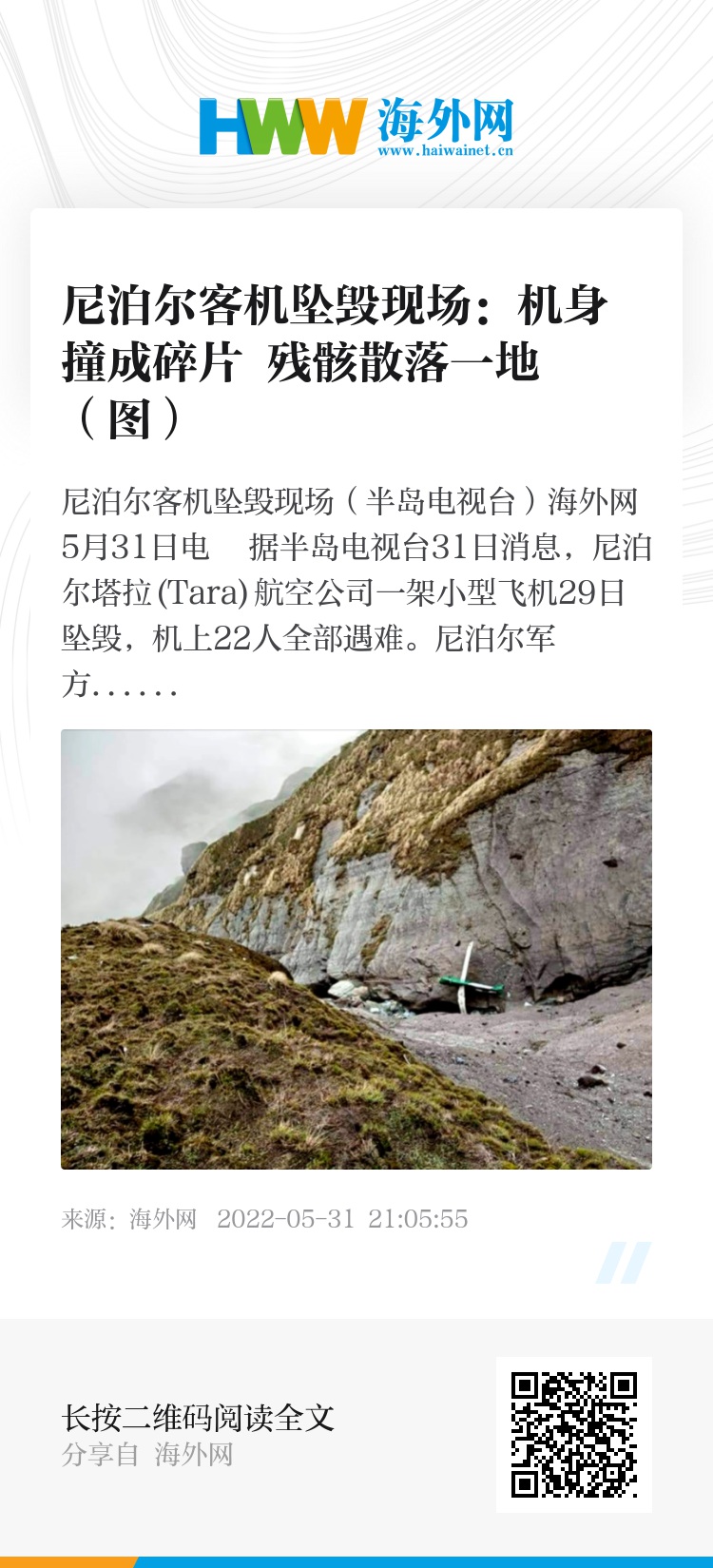 海外网5月31日电 据半岛电视台31日消息,尼泊尔塔拉(Tara)航空公司一架小型飞机29日坠毁,机上22人全部遇难。尼泊尔军方日前公布了飞机坠毁现场视频及照片。