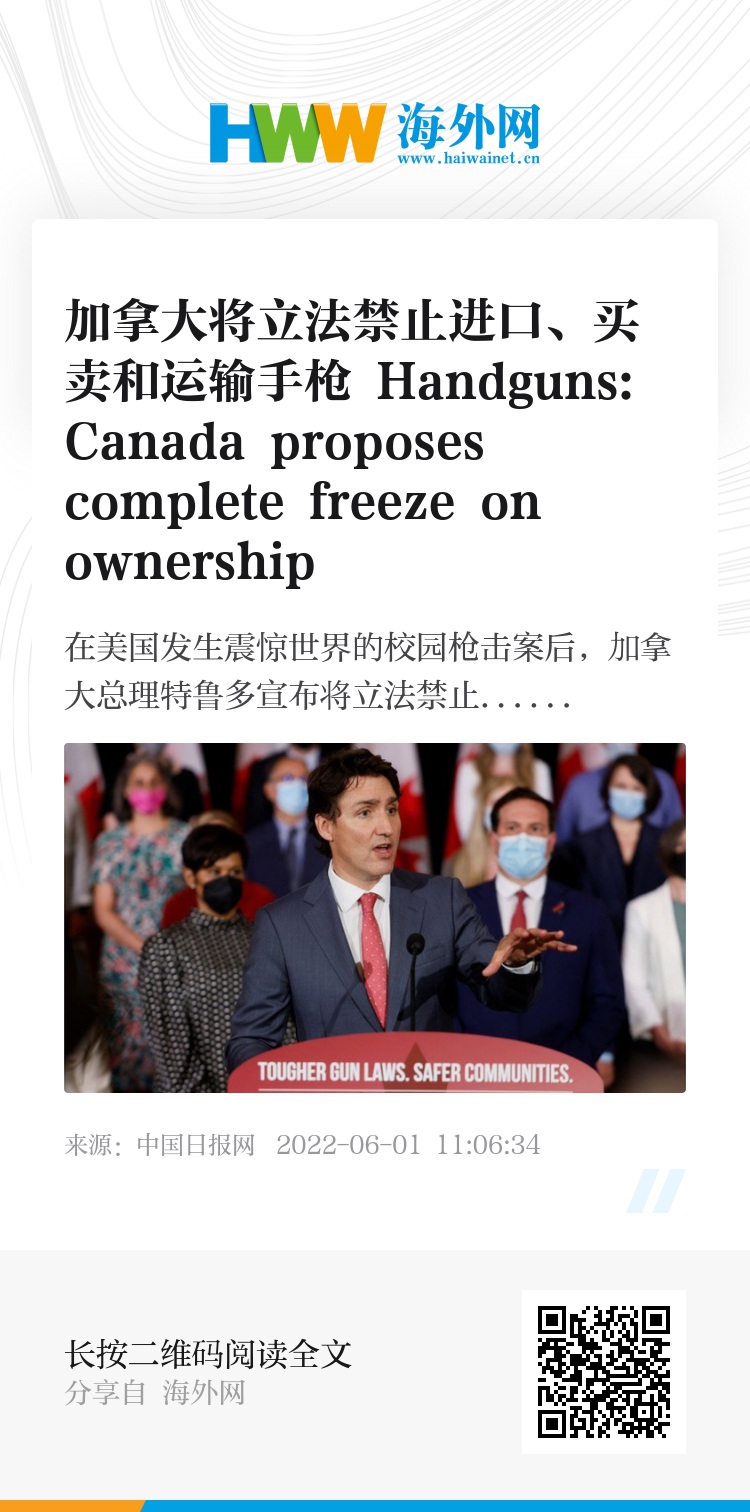 5月30日呈交加拿大国会的这一法案禁止在全加任何地方买卖、运输和进口手枪。