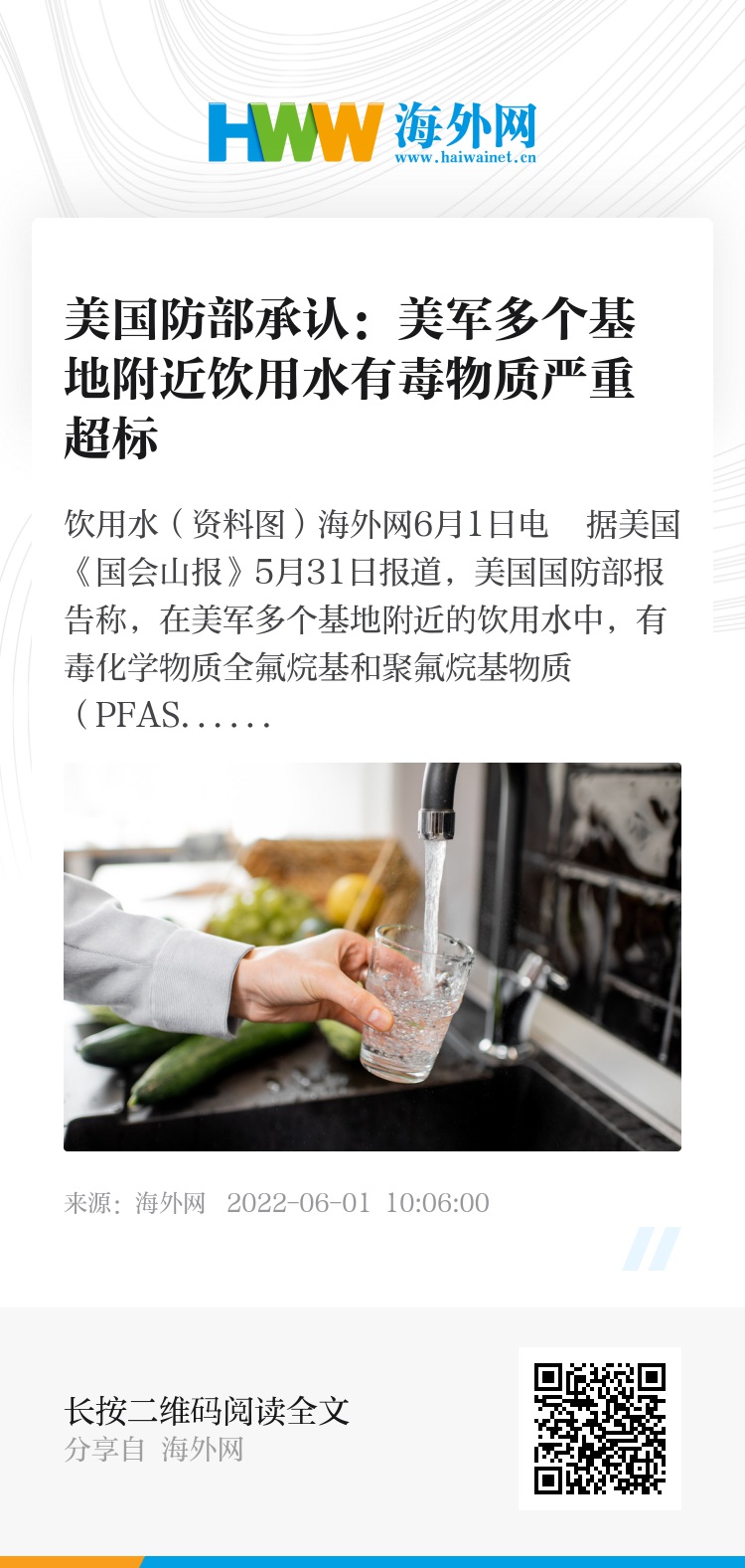 海外网6月1日电 据美国《国会山报》5月31日报道,美国国防部报告称,在美军多个基地附近的饮用水中,有毒化学物质全氟烷基和聚氟烷基物质(PFAS)的含量严重超标。