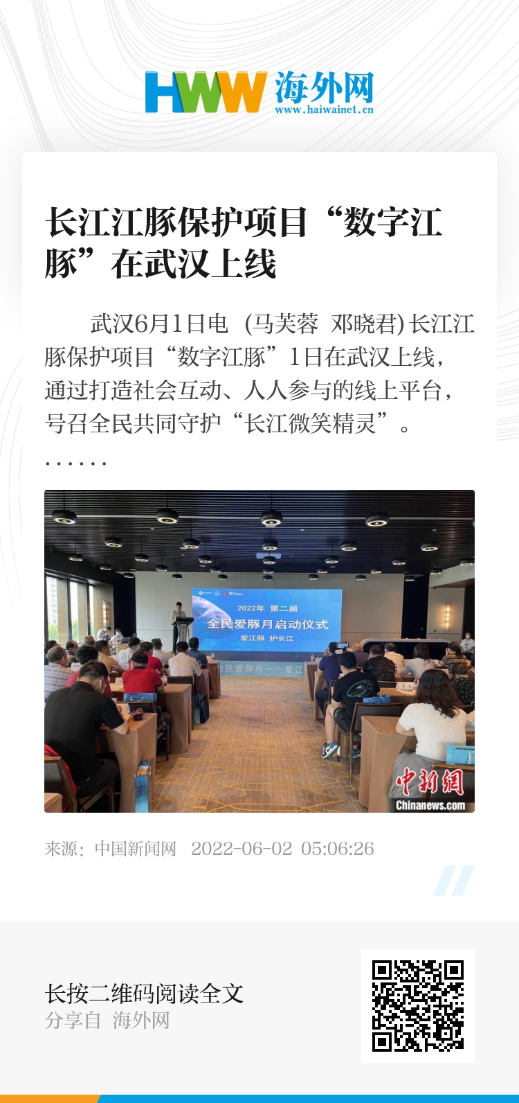 6月是野外长江江豚繁殖活动最为活跃的月份,也是江豚母子最需要人类呵护的月份。当天,由武汉白鱀豚保护基金会主办的2022年第二届“全民爱豚月”正式启动,“数字江豚”是本届“全民爱豚月”的重要活动之一。