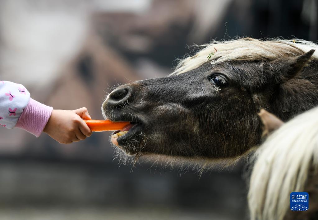 6月1日,在新疆古生态园汗血马基地,一名小朋友给小矮马喂胡萝卜。