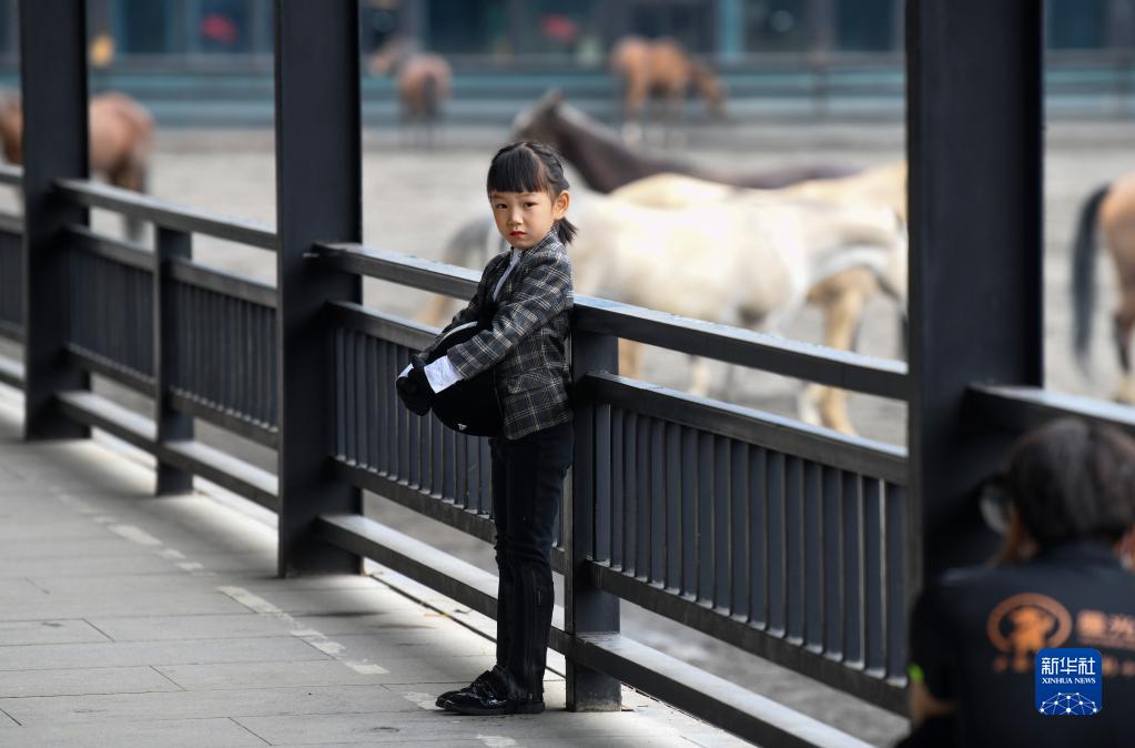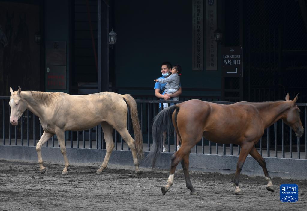6月1日,在新疆古生态园汗血马基地,一名小朋友在家人陪伴下参观汗血马。
