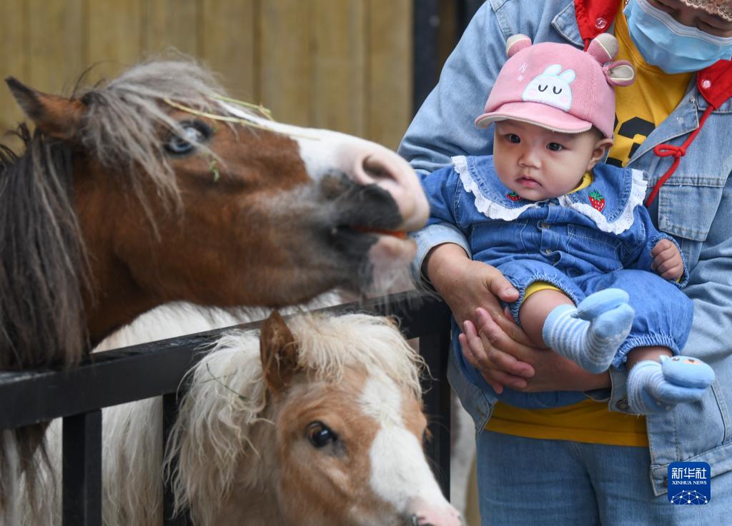 6月1日,在新疆古生态园汗血马基地,一名小宝宝近距离观看小矮马。