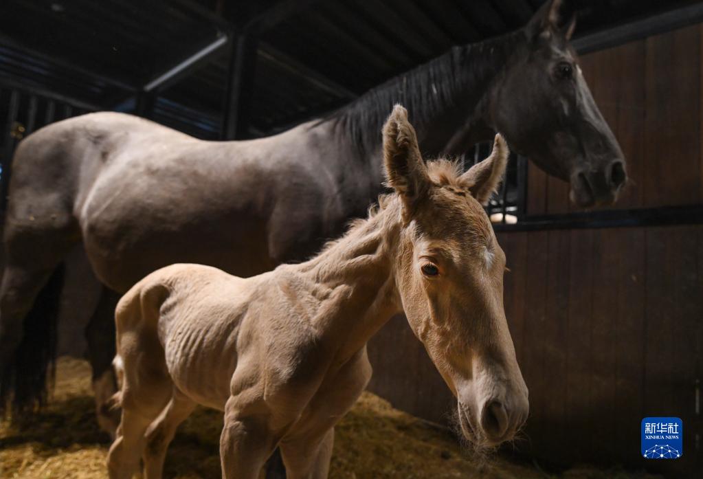 6月1日,在新疆古生态园汗血马基地,一匹出生刚一天的汗血马马驹和妈妈在一起。