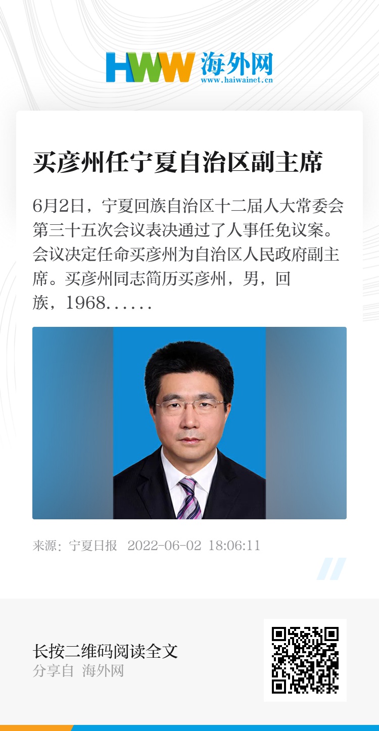 6月2日,宁夏回族自治区十二届人大常委会第三十五次会议表决通过了人事任免议案。会议决定任命买彦州为自治区人民政府副主席。
