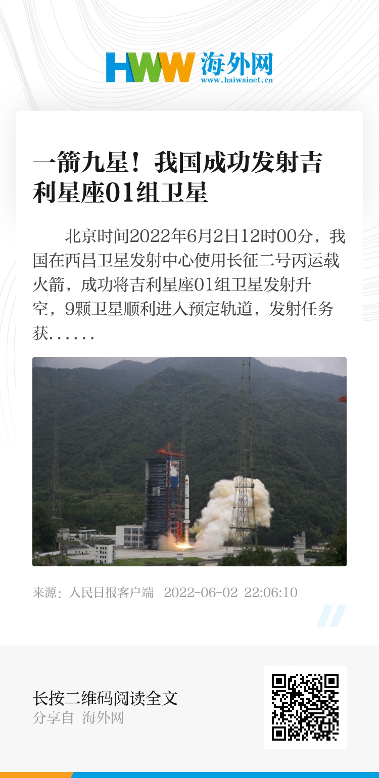 北京时间2022年6月2日12时00分,我国在西昌卫星发射中心使用长征二号丙运载火箭,成功将吉利星座01组卫星发射升空,9颗卫星顺利进入预定轨道,发射任务获得圆满成功。该卫星主要用于智能联网汽车未来出行服务、车机/手机卫星交互等相关技术研究及验证,支撑相关海洋环保公益行动。