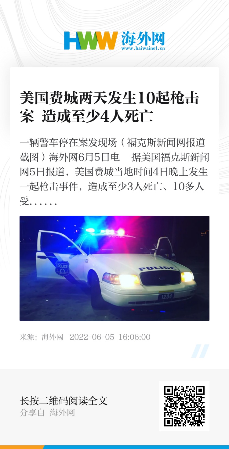 海外网6月5日电 据美国福克斯新闻网5日报道,美国费城当地时间4日晚上发生一起枪击事件,造成至少3人死亡、10多人受伤。截至案发的两天内,费城已累计发生10起枪击事件,导致至少4人死亡、20多人受伤,死者还包括一名孕妇。