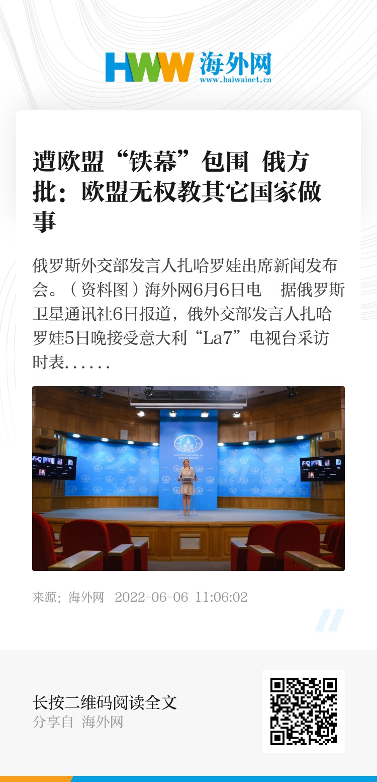 海外网6月6日电 据俄罗斯卫星通讯社6日报道,俄外交部发言人扎哈罗娃5日晚接受意大利“La7”电视台采访时表示,欧盟没有权利命令和教导其它国家做事。