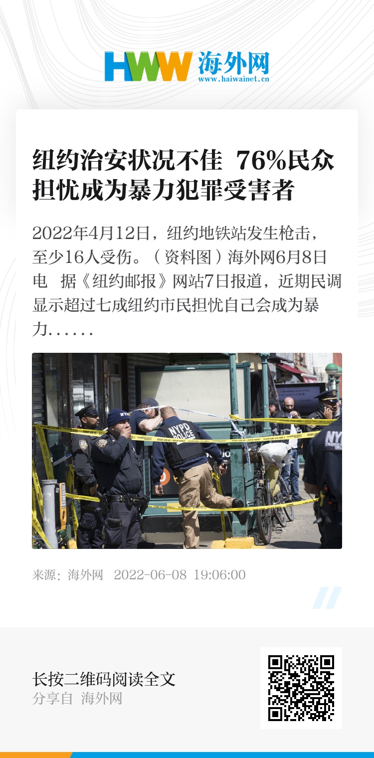 海外网6月8日电 据《纽约邮报》网站7日报道,近期民调显示超过七成纽约市民担忧自己会成为暴力犯罪受害者。当前,纽约市治安状况仍处于不良态势,枪击案及其它重大犯罪数量继续增加。