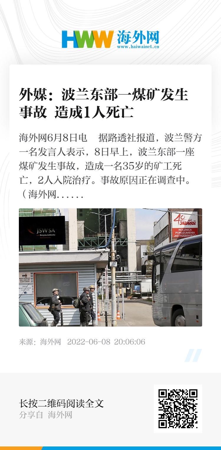 海外网6月8日电 据路透社报道,波兰警方一名发言人表示,8日早上,波兰东部一座煤矿发生事故,造成一名35岁的矿工死亡,2人入院治疗。事故原因正在调查中。(海外网 李芳)
