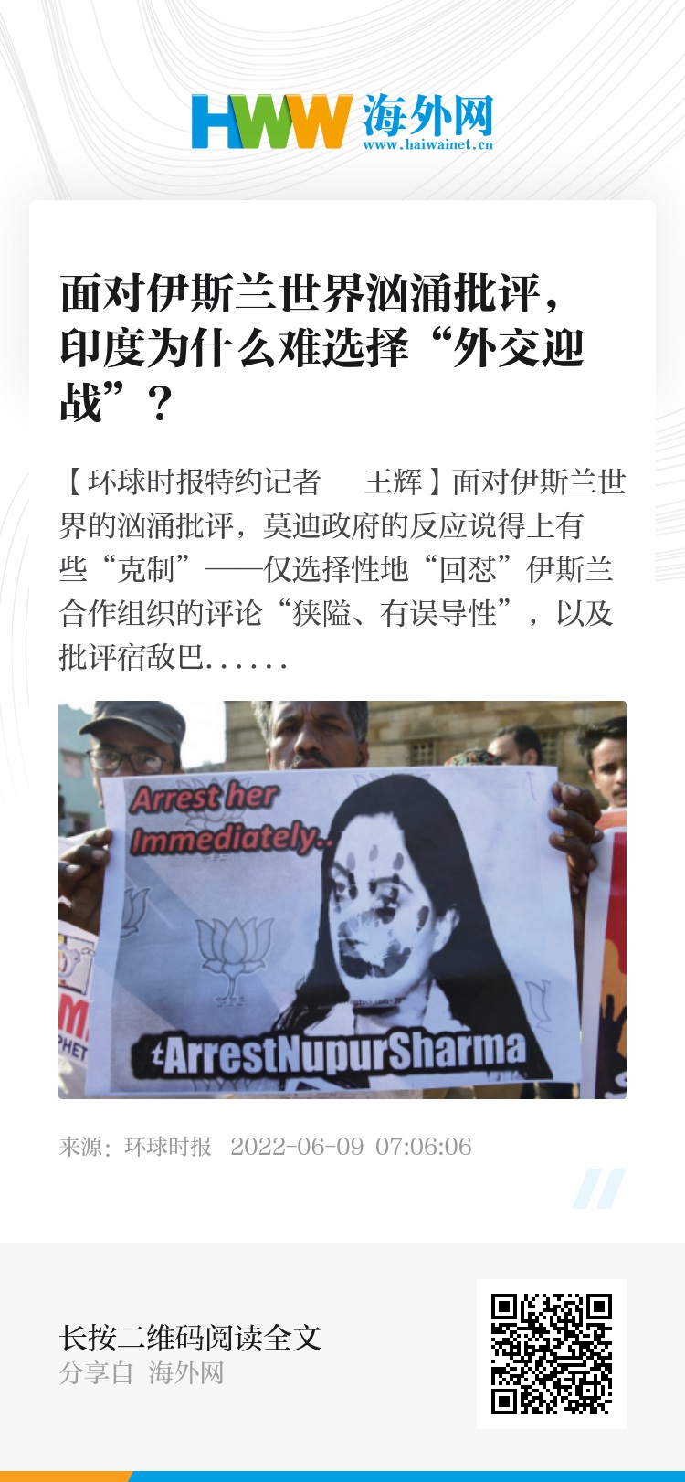 “从印度的视角来看,与海湾国家的关系非常重要。”国际战略研究所巴林研究员阿尔哈桑评论说。印度《商业标准报》8日不安地问道:印度人民党前发言人侮辱伊斯兰教先知的言论会影响印度与海湾地区的贸易关系吗?目前,这个问题尚无定论。新德里电视台评论称,无论如何,来自阿拉伯国家的抗议对新德里精心经营的关系是一次重大挫折,这些关系在战略和经济上都具有重要意义。