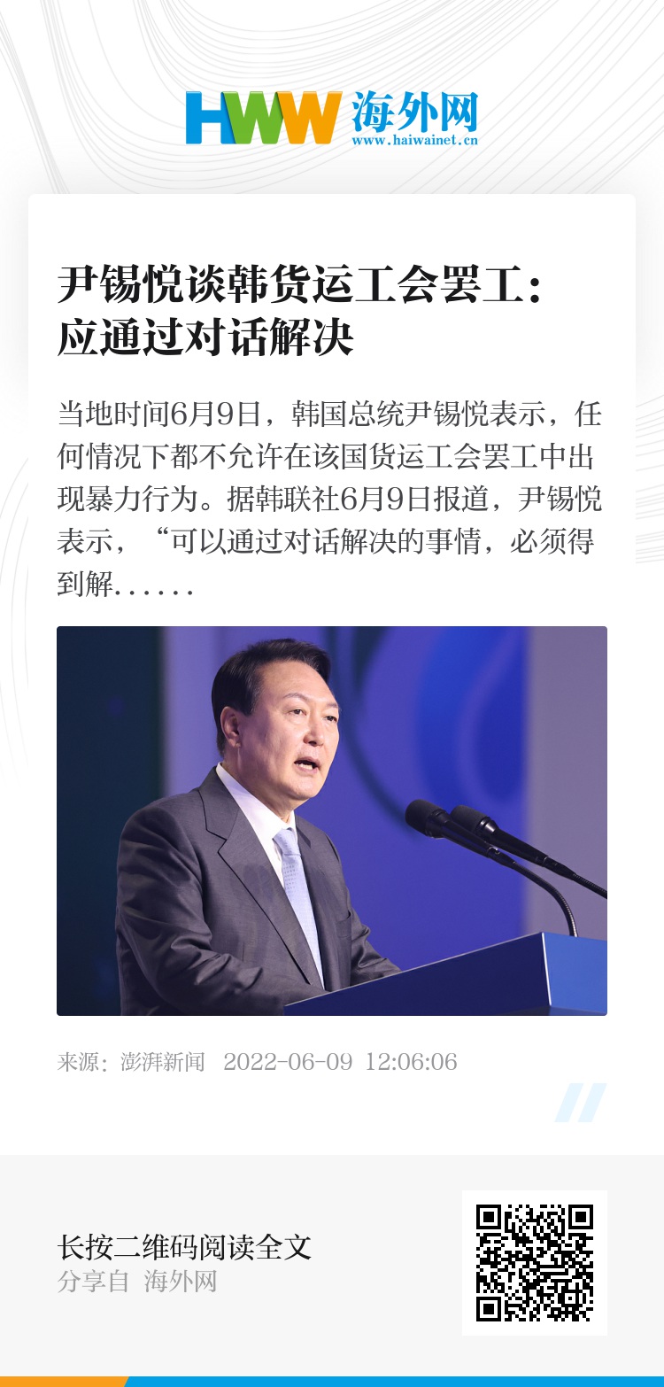 当地时间6月9日,韩国总统尹锡悦表示,任何情况下都不允许在该国货运工会罢工中出现暴力行为。