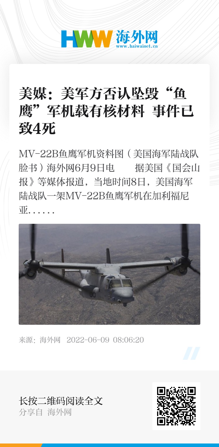 海外网6月9日电 据美国《国会山报》等媒体报道,当地时间8日,美国海军陆战队一架MV-22B鱼鹰军机在加利福尼亚州坠毁,导致4人死亡,1人仍失踪。美军方否认了机上载有核材料的传言。